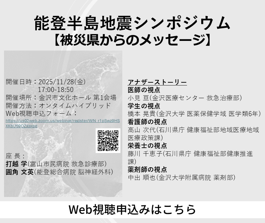 HOME 会長あいさつ 開催概要 プログラム・抄録集 演題募集 参加登録 各種セミナー/ポストコングレス お申込み 参加者の皆さまへ 座長/演者の皆さまへ 会場アクセス 協賛募集のご案内 お問い合わせ 学会ポスターをダウンロード お知らせ新着情報 11/28 能登半島地震シンポジウム Web視聴申込み(無料配信)を開始しました。 2025年11月14日 プログラム・抄録集を公開しました。 2025年11月11日 HP-CPRコンテストの募集条件を変更しました。 バイスタンダー単独チーム、救急隊単独チームでの参加も可能です。 ぜひお気軽にエントリーしてください! 2025年10月15日 採択通知をお送りいたしました。 2025年10月6日 各種セミナー/ポストコングレスの申込みを受け付けております。 2025年9月26日 広報 この投稿をInstagramで見る日本救急医学会中部地方会(@jaamchubu)がシェアした投稿 この投稿をInstagramで見る金沢大学附属病院 救急科(@kanazawa_u_emergency)がシェアした投稿